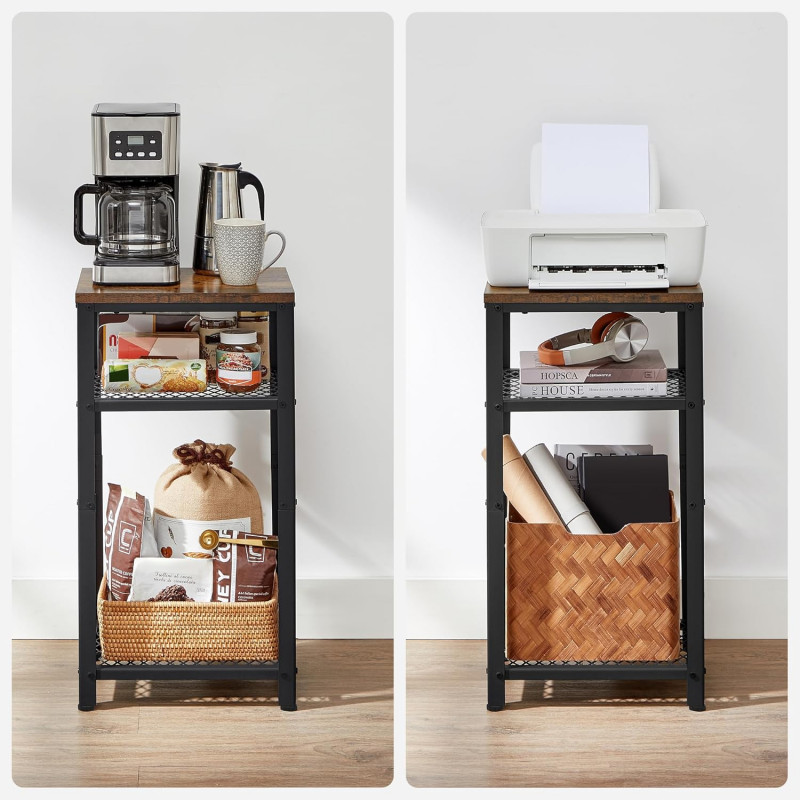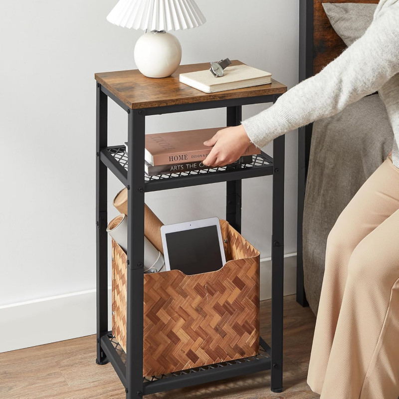 Scurta descriere Aceasta masuta laterala VASAGLE imbina perfect stilul vintage cu functionalitatea moderna. Cu doua rafturi tip grilaj si un blat decorativ in aspect de lemn vechi, este ideala ca suport pentru telefon, carti sau chei in orice incapere. Structura metalica solida asigura stabilitate, iar dimensiunile compacte o fac potrivita chiar si pentru spatii restranse.