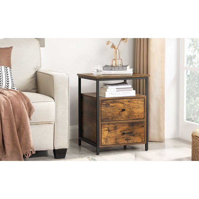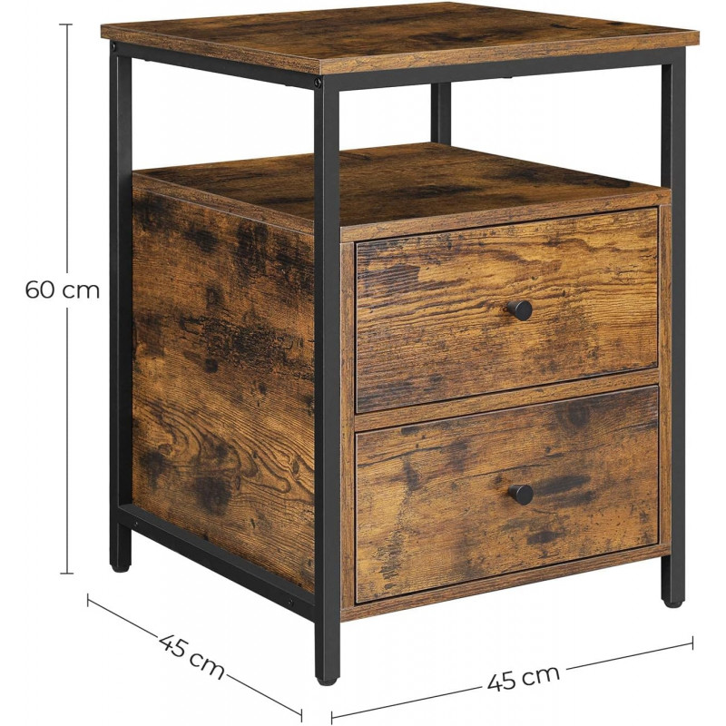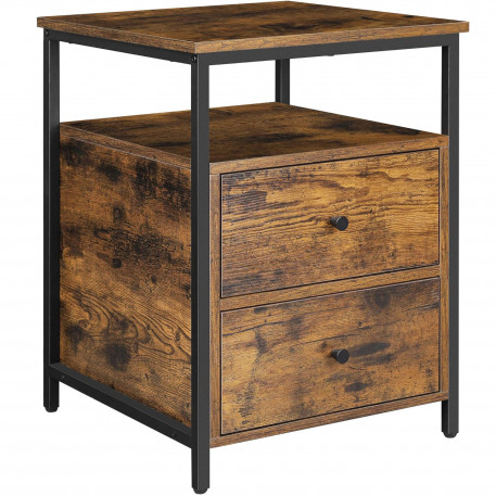Capacitate de incarcare statica totala: 40 kg Despre acest articol Aceasta noptiera rustica maro si neagra aduce o vibratie de stil industrial in dormitorul dvs.Compartimentul superior si cel deschis pot gazdui o lampa, un pahar si telefonul dvs. Cele 2 sertare sunt perfecte pentru a tine cartile si lucrurile la indemana.Placile aglomerate de inalta calitate si barele de otel rezistente asigura o structura stabila. Picioarele reglabile asigura o stabilitate excelenta chiar si pe un teren usor denivelat.Datorita mecanismelor sale silentioase, puteti deschide sertarele fara sa va treziti partenerul de viata pe timp de noapte. In partea de jos, un spatiu intre baza masutei si podea faciliteaza curatarea.Cu o structura simpla, piese numerotate si