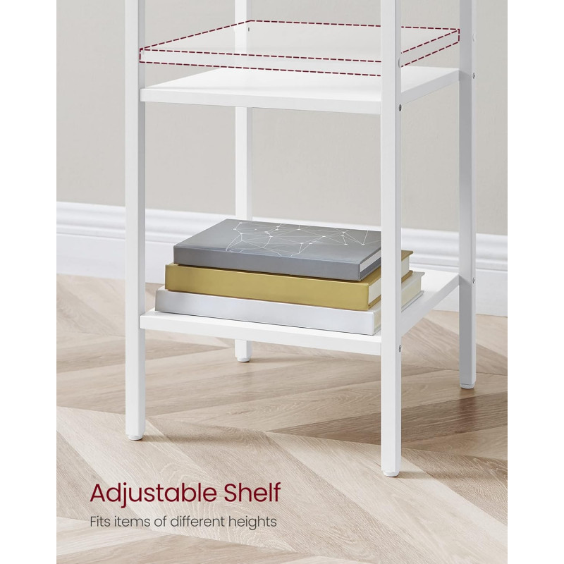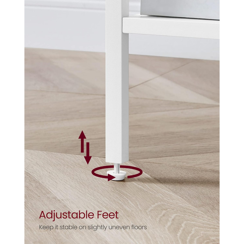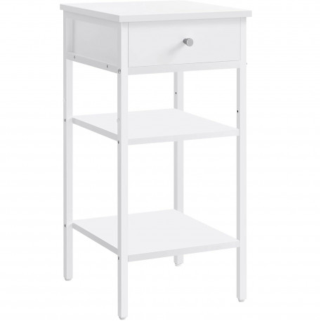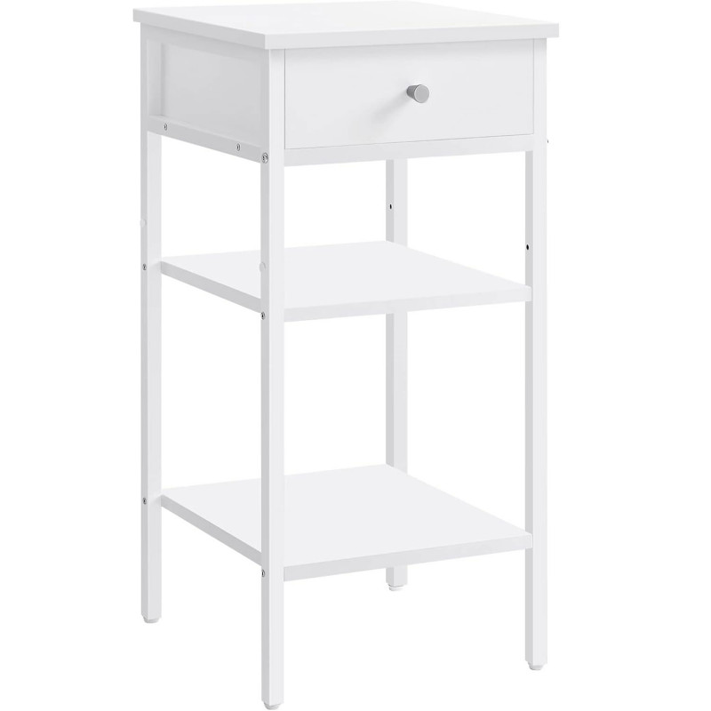 Instructiuni Note VASAGLE: Pentru siguranta, asigurati-va ca fixati aceasta noptiera de perete cu kitul anti-tip inclus.Copiii nu au voie sa se urce sau sa se joace cu masuta de noptiera pentru siguranta. Stil modern Designul modern al acestei noptiere, cu culoarea sa alba si aspectul sau contemporan, este accentuat de tuburile albe care ii confera un aspect minimalist. Uitati-va la sertar si rafturi, sunt simple si practice! Compacta, dar practica Cu o dimensiune de 35 x 35 x 70 cm, aceasta masuta ocupa putin spatiu pe podea, este practica langa pat, in hol sau ca capat de canapea, se potriveste perfect in spatii mici 3 spatii de depozitare Aceasta masuta laterala ofera 3 spatii de depozitare: blat, sertar si 2 rafturi deschise. Aveti suficient spatiu pentru o lampa, carti si decoratiuni dragute Structura puternica Fabricata din PAL si otel, aceasta piesa are o structura robusta, suporta pana la 40 kg in total: 20 kg in partea de sus, 5 kg in sertar si 10 kg pentru fiecare raft Asamblare usoara Cu piese numerotate si