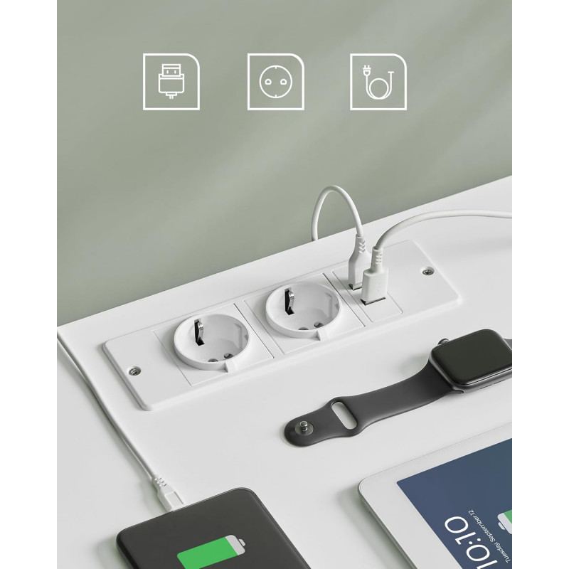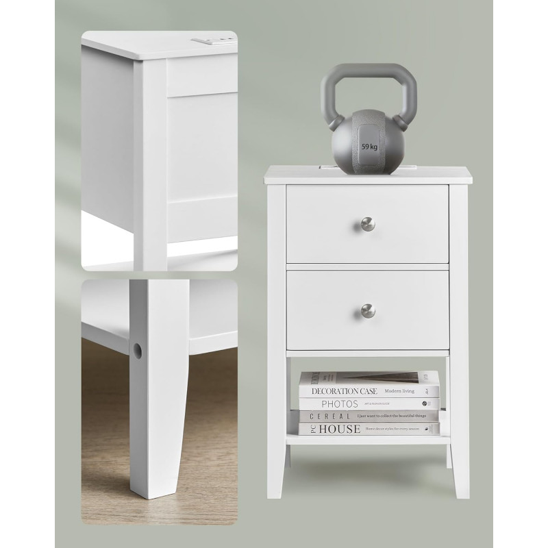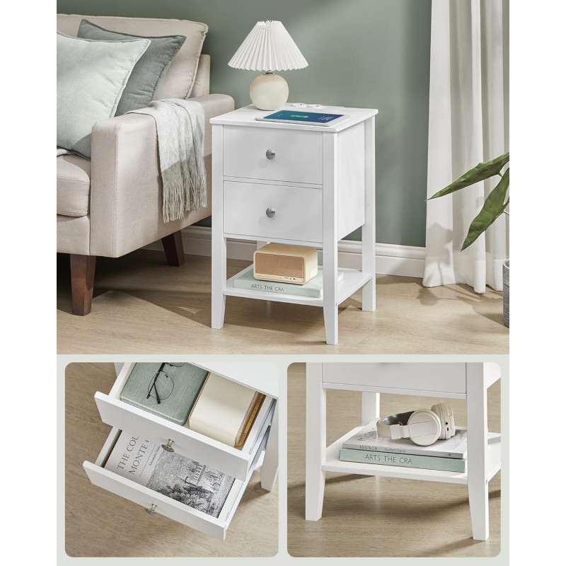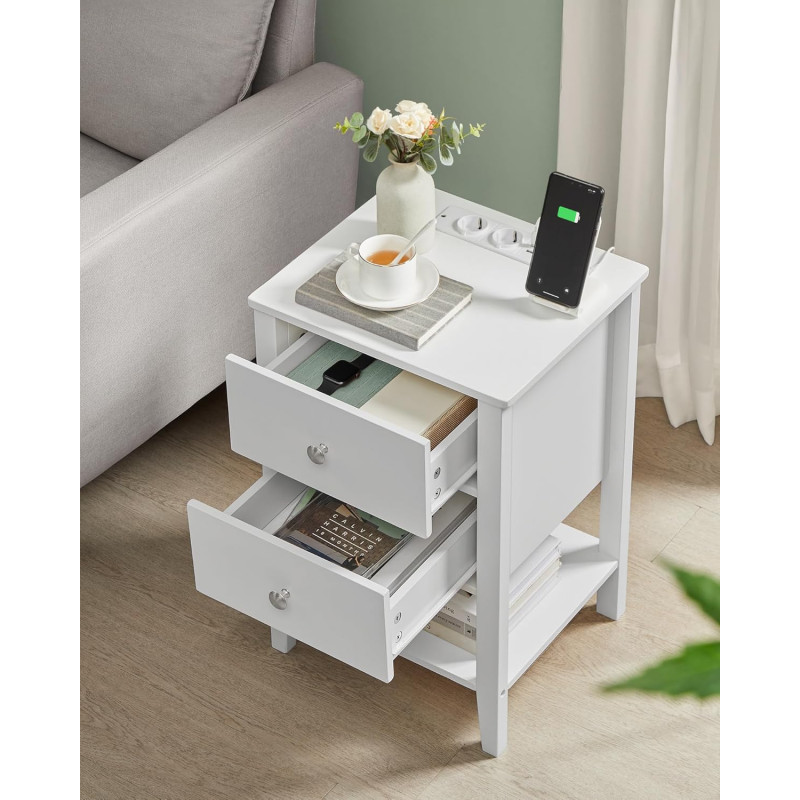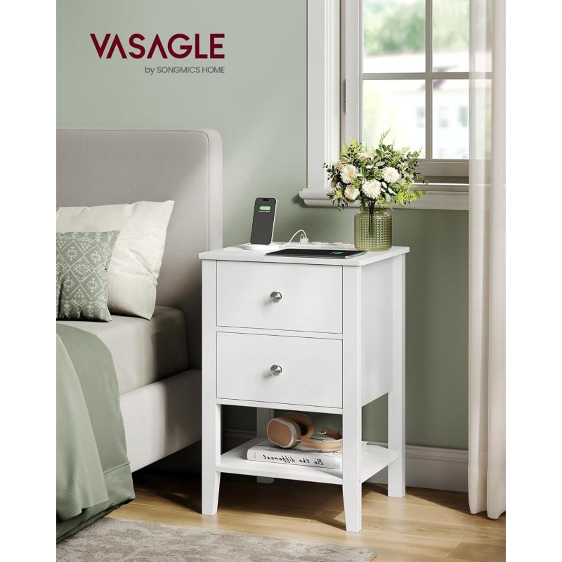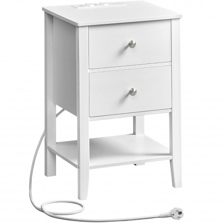 Ce primiti: - 1 x noptiera.- 1 x pachet de accesorii.- 1 x manual Note VASAGLE: - Nu depasiti capacitatea maxima de incarcare a masutei de pat. Rezistenta bambusului Datorita picioarelor si blatului de masa din bambus natural, aceasta noptiera este extrem de robusta si durabila. Incarcare simplificata Aceasta masa de noptiera cu 2 prize si 2 porturi USB-A va permite sa incarcati cu usurinta mai multe dispozitive in pat sau pe canapea. Nu mai aveti probleme cu prize inaccesibile sau cabluri incalcite Minimalist si elegant Cu liniile sale clare si culoarea alba tulbure, „mai putin inseamna mai mult” se aplica noptierei. Ea emana un farmec atemporal si se potriveste fara efort in orice camera, fie ca este vorba de dormitor, living sau alte incaperi mici. Mult spatiu de depozitare Cu o tava mare pentru lampi sau decoratiuni, 2 sertare inchise pentru a va ascunde lucrurile personale si un raft deschis pentru carti, aceasta noptiera aduce ordine si confort in casa dvs. Ingrijire si asamblare usoara Suprafata lacuita hidrofuga face ca aceasta masuta de cafea sa fie usor de intretinut - pur si simplu stergeti cu o carpa umeda! Datorita pieselor etichetate si