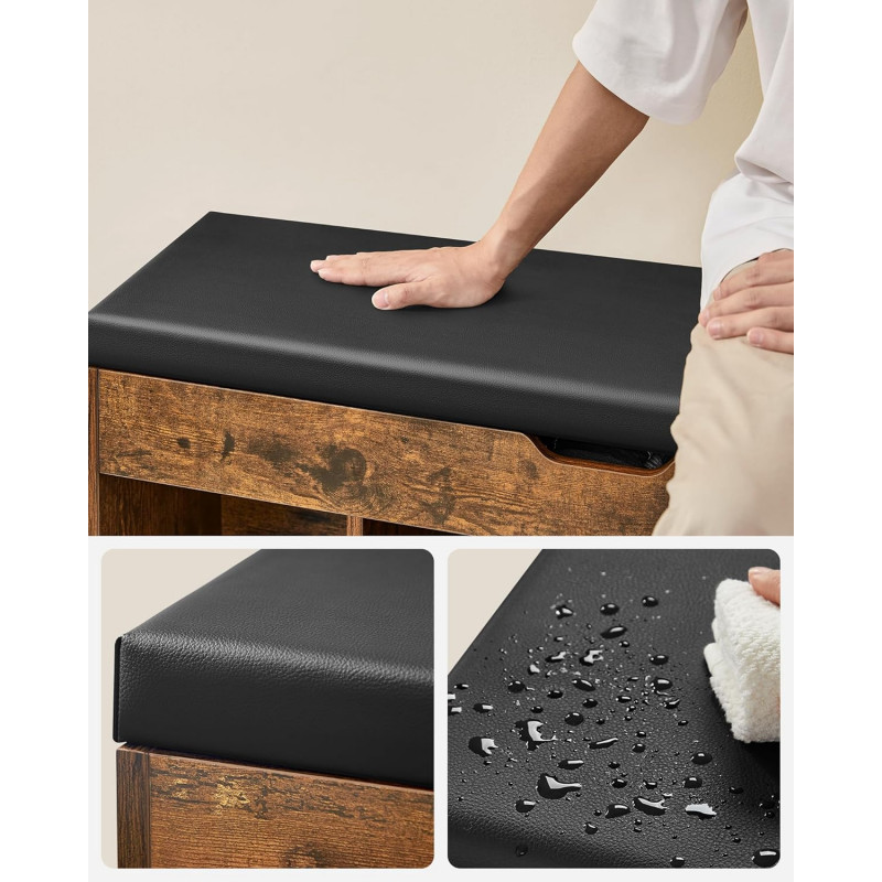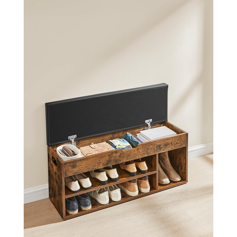 Scurta descriere VASAGLE este o banca pentru pantofi cu design rustic, ideala pentru hol, dormitor sau living. Dispune de 3 compartimente deschise pentru incaltaminte si un spatiu de depozitare ascuns sub capac, perfect pentru manusi, esarfe sau accesorii. Sezutul captusit cu spuma si acoperit cu piele PU ofera confort la incaltare, iar structura solida suporta pana la 150 kg.