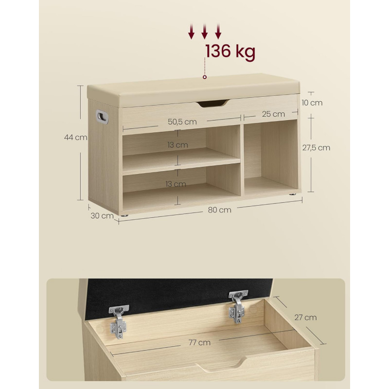 Spatioasa: Aceasta banca pentru pantofi de 30 x 80 x 44 cm (D x l x H) are un compartiment inalt de 7 cm sub scaun, unde puteti depozita manusi, carti etc. Compartimentele deschise inferioare pot gazdui pana la 7 perechi de pantofi sau echipamentul dvs. sportiv.