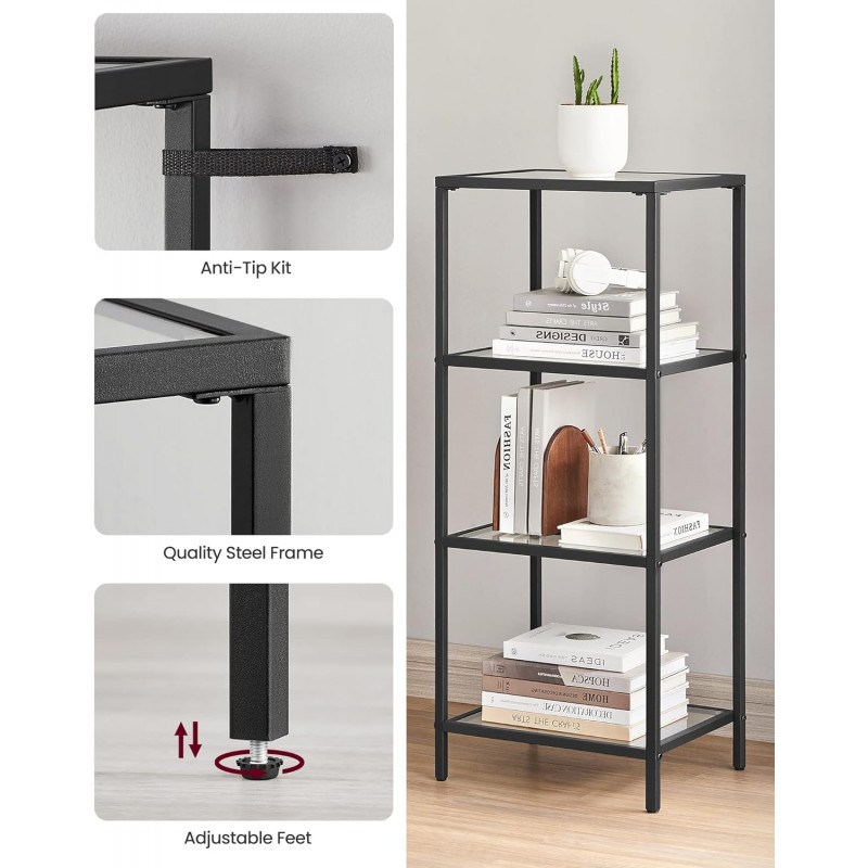 Capacitate de incarcare statica totala: 40 kg Despre acest articol Cu rafturi din sticla transparenta si o rama neagra, acest raft cu 4 nivele se mandreste cu un model impresionant. Acest mic raft va permite sa va expuneti florile, cartile si obiectele de colectie, ridicand in acelasi timp aspectul spatiului dvs.Cu dimensiune de 30 x 40 x 95 cm, acest raft deschis pe 4 niveluri cu o inaltime de 95 cm va permite sa utilizati la maxim spatiul vertical pentru depozitare.Nu trebuie sa va faceti griji cu privire la asamblarea acestui raft. Instructiunile clare si piesele numerotate va vor ajuta sa il asamblati cu usurinta.Un raft subtire pentru carti in birou? Un raft de expunere pentru bibelouri in camera de zi? Un raft deschis pentru fotografii in dormitor? Acest raft ingust cu 4 nivele va acopera toate nevoile.Aceasta biblioteca subtire, realizata din sticla calita de 4 mm grosime si un cadru din otel, este foarte solid. Picioarele reglabile sporesc stabilitatea, iar kitul anti-inclinare sporeste siguranta.