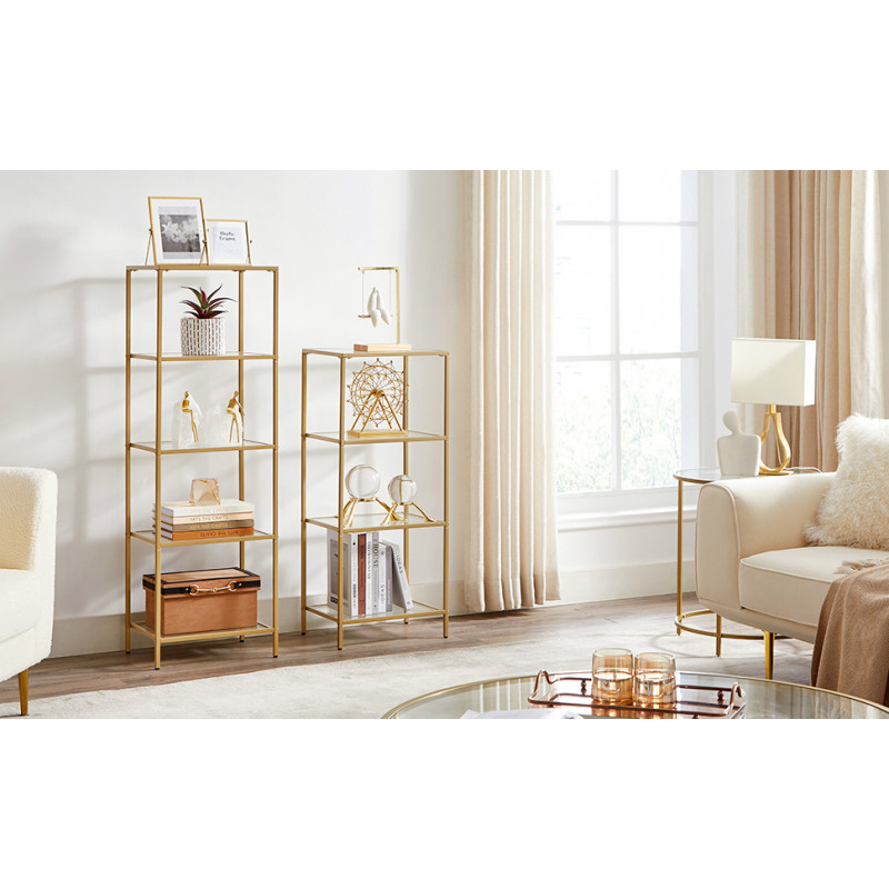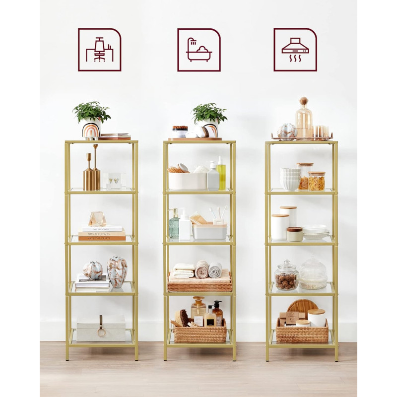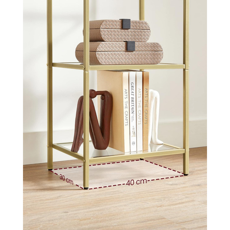 Asamblare necesara: Da Despre acest articol Casa ta merita un pic de lux: linii drepte, panouri de sticla si un cadru de otel auriu... plaseaza acest raft simplu, dar elegant in casa ta si creeaza o ambianta luxoasa.Stabil si durabil: Cu cadrul robust din otel si rafturile din sticla securizata premium, aceasta unitate stabila de rafturi cu scara suporta pana la 10 kg pe nivel. Picioarele reglabile incluse si dispozitivele anti-rasturnare sporesc stabilitate.Versatila: Aceasta polita de sticla functioneaza bine in baie pentru prosoape, in birou pentru carti, in sufragerie pentru decoratiuni sau in bucatarie pentru vasele tale!Usor de asamblat: piesele numerotate si