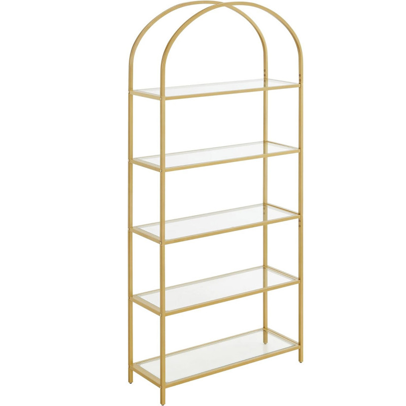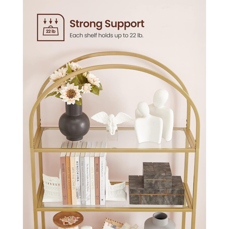 instructiuni (limba engleza nu este garantata) Despre acest articol Comorile tale ar trebui sa fie aratate pe un suport care sa fie demn de ele, la fel ca acest raft de depozitare; cu designul sau sic, in forma de arc si rafturile din sticla transparenta inconjurate de otel de culoare aurie, va evidentia tot ceea ce pretuiesti 5x rafturi pentru orice: Aceasta unitate de rafturi de 30,2 x 83 x 183,5 cm are 5 rafturi largi, cu o distanta de 31,2 cm intre fiecare nivel, pentru a oferi o multime de spatiu pentru bijuterii, carti, rame foto, vaze si multe altele. Suport ferm, sustine constant: Rafturile din sticla securizata cu grosimea de 5 mm, cu tampoane anti-alunecare, pot sustine in mod stabil 10 kg fiecare; picioarele reglabile mentin raftul de carti echilibrat; un kit anti-rasturnare ofera un plus de stabilitate