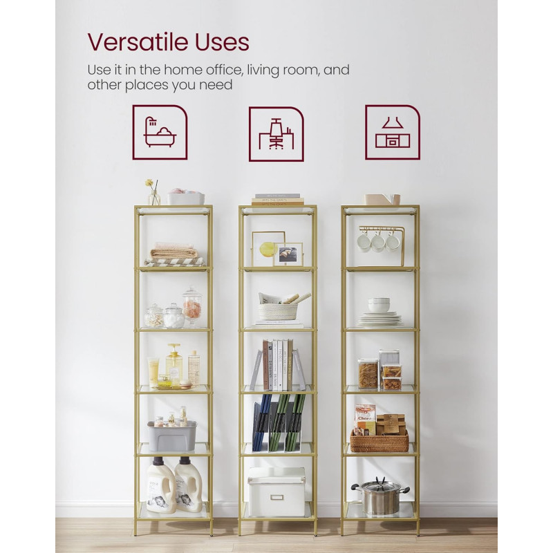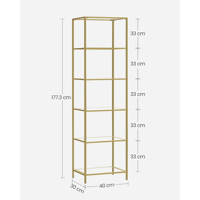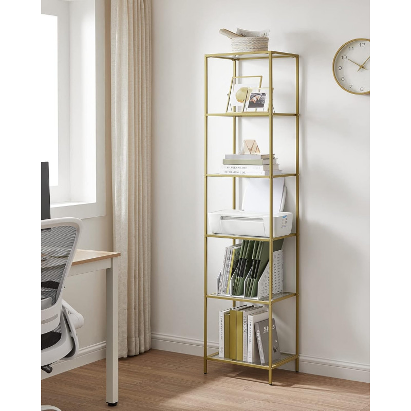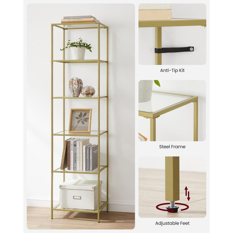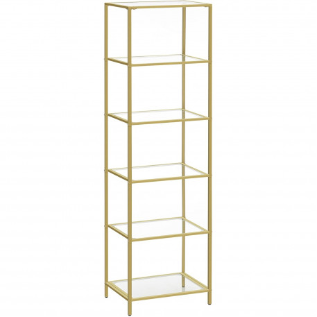 Scurta descriere Biblioteca VASAGLE cu 6 rafturi din sticla este alegerea ideala pentru un decor elegant si aerisit. Designul minimalist cu cadru auriu si rafturi transparente pune in valoare obiectele expuse, fiind perfecta pentru plante, carti sau decoratiuni. Formatul slim permite utilizarea eficienta a spatiului pe verticala.