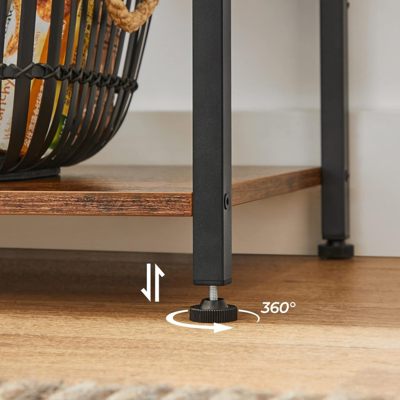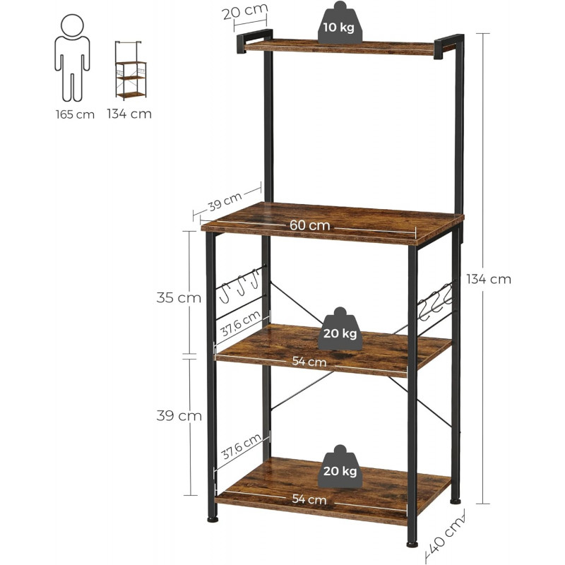 Dimensiunile produsului: 40 D x 54 W x 134 H centimetri Despre acest articol Bucataria ta nu este suficient de eleganta? O combinatie eleganta de maro rustic si negru mat ofera raftului un aspect unic pe care il poti arata gustul tau la urmatoarea cina cu prietenii Acest suport de brutar o repara. Pe rafturile de 60 x 40 cm cu 3 nivele se gasesc oale, boluri, farfurii si chiar cuptor cu microunde. Asezati borcanele de condimente pe raftul de sus, ingust. Agatati spatulele si prosoapele pe carligele 6 SFoloseste-ti imaginatia Acest raft nu poate fi folosit doar pentru a depozita articole de bucatarie, dar este si grozav in birou sau in studiu pentru a plasa fisiere, carti, imprimante, rame foto si plante. Depinde de tine!Fara vibratii, fara griji: cadrele robuste din otel si panourile durabile din PAL asigura stabilitate; cu structura in forma de X pe spate, picioare reglabile si un set de inclinare, poti pune farfuria valoroasa de la mama ta fara sa-ti faci griji Ocupat cu pregatirea cina pentru petrecerea de familie? Relaxati-va. Nu facem niciun efort atunci cand gatim. Acest raft de bucatarie include