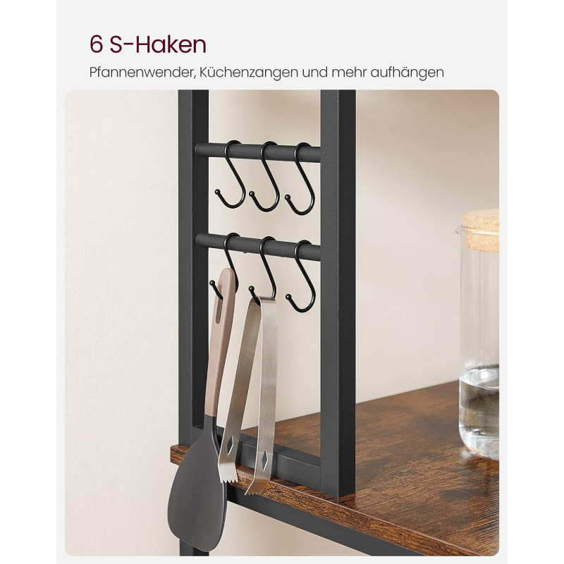 Spatios: Economisiti spatiu pe blatul dvs. cu acest raft de bucatarie spatios - 3 rafturi superioare pentru borcane de condimente, 3 rafturi inferioare mari pentru aparatele de bucatarie si 6 carlige S pentru unelte. Acest raft all-in-one aduce ordine in bucataria dvs. Raftul din mijloc in partea de jos - reglabil in inaltime: Acest raft poate fi ajustat la 2 inaltimi, permitandu-va sa gazduiti ustensile de diferite dimensiuni, de la blender la friteuza cu aer comprimat si pana la oale si tigai Constructie solida : Datorita combinatiei dintre cadrul robust din otel si panoul aglomerat durabil, acest raft in picioare este puternic, solid si poate rezista cu usurinta la cuptorul cu microunde, masina de cafea si alte ustensile
