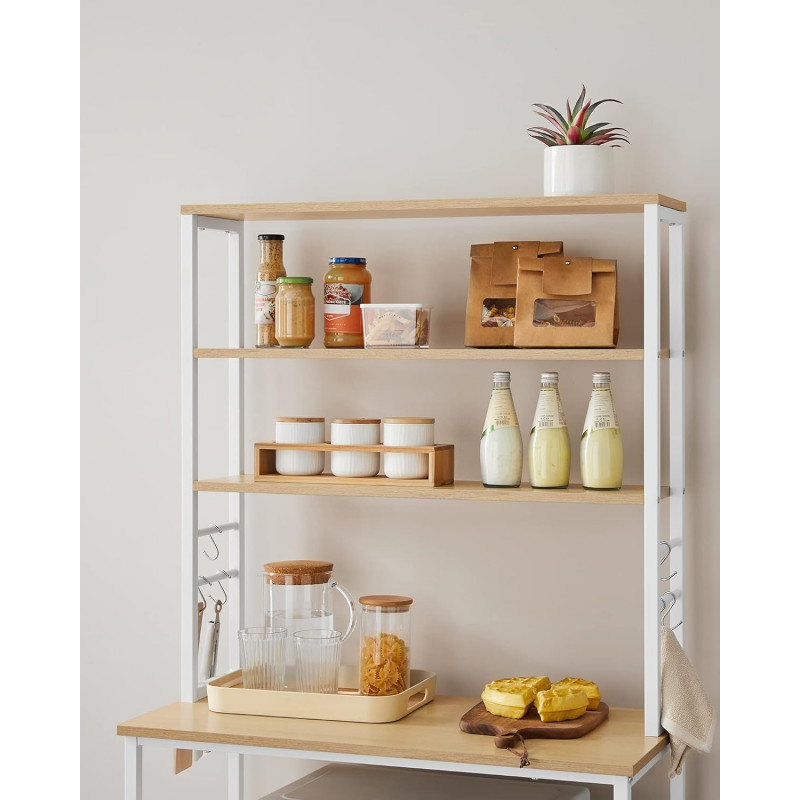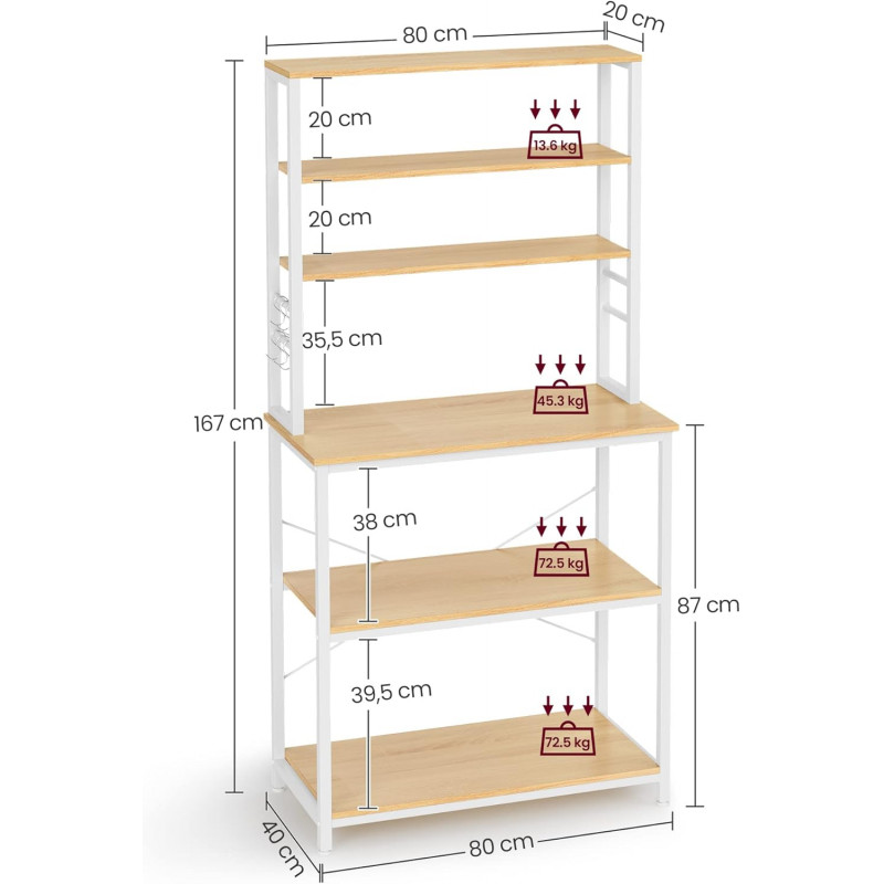 Continutul cutiei: - 1 x raft de bucatarie.- 6 x carlige S- 1 x dispozitiv anti-inclinare- 1 x kit de montare.- 1 x manual de utilizare Precautii VASAGLE: - Copiilor le este interzis sa se urce pe raft si sa se joace cu el.- Din motive de siguranta, va rugam sa atasati raftul la perete cu dispozitivul anti-basculare inclus.- Verificati daca dimensiunea cuptorului dvs. cu microunde si a altor articole de bucatarie este potrivita pentru acest raft. Pentru a depozita totul Cu un spatiu generos de depozitare, puneti articolele si aparatele dvs. pe acest raft de bucatarie. Exista 3 rafturi in partea de sus pentru sticle, 3 rafturi mari in partea de jos pentru aparatele dvs., 6 carlige pentru agatarea ustensilelor. Raft central inferior reglabil Raftul central al partii inferioare este reglabil in 2 inaltimi pentru a se potrivi fara probleme cu dimensiunea ustensilelor, blenderelor, prajitoarelor, oalelor sau tigailor dvs. Structura robusta Fabricat din otel si PAL, acest raft de depozitare este suficient de puternic pentru a sustine cuptorul cu microunde, aparatul de cafea si alte aparate si ustensile Pentru spatii mici Cu o dimensiune de 40 x 80 x 167 cm, acest raft cu 6 niveluri se potriveste perfect in bucatariile mici, este ideal ca un colt pentru cafea si va permite sa optimizati spatiul Stabil si sigur Datorita picioarelor sale reglabile, acest raft industrial ramane stabil fara a zgaria podeaua. Fixati-l la perete cu kitul anti-inclinare inclus, acesta va asigura ca il puteti folosi cu siguranta, mai ales daca aveti copii sau animale de companie Asamblare usoara Cu