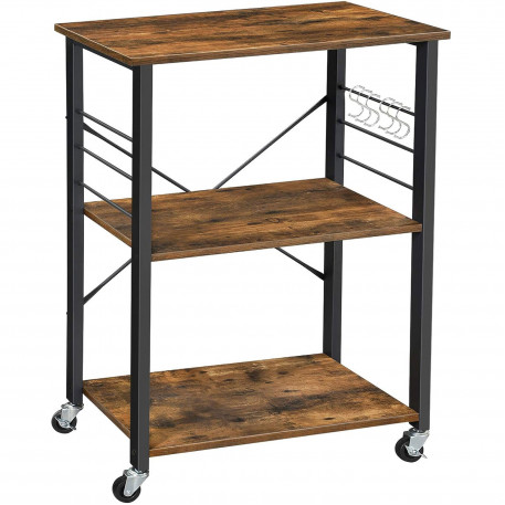 Finisaj: mobila maro Despre acest articol Daca prajitoarele de paine si ceainicele electrice trebuie mutate pe podea pentru a face loc, este timpul pentru acest raft de bucatarie cu un trio de rafturi de 54 x 37,5 cm. Asezati cuptorul cu microunde la nivelul superior.Acest carucior se deplaseaza prin bucatarie pe 4 roti rezistente, oferind condimente, uleiuri si sosuri chiar langa aragaz. Blocati cele doua frane de pe caruciorul mobil pentru a impiedica ingredientele sa se rostogoleasca. Pe langa raft, va trimitem si 6 carlige in forma de S, care sunt perfecte pentru a agata linguri de gatit sau prosoape uscate.Conectati tijele metalice solide de 20 x 40 mm si insurubati rafturile. In doar 15 minute, veti avea un raft solid si multifunctional pentru bucataria sau biroul dvs. Rasfatati-va bucataria cu acest carucior de servire atractiv.