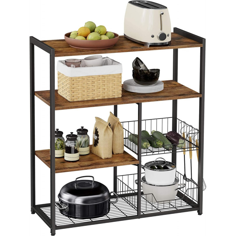 Marca: VASAGLE Despre acest articol Bucatar amator sau bucatar cu stele? Oricare ai fi, pentru tine ordinea este pe primul loc in bucatarie. Cu mai multe rafturi pentru conserve si farfurii, 2 cosuri cu ochiuri de 9 cm adancime pentru fructe si 6 carlige pentru ustensile, acest raft de bucatarie va ajuta sa va pregatiti cu usurinta pentru a gati delicatesele.Reteta secreta: O structura din tuburi de otel dreptunghiulare de 15 x 30 mm grosime, rafturi durabile cu granulatie romantica de lemn rustic si picioare reglabile care mentin raftul pentru microunde stabil si echilibrat.Rafturi adanci dispuse la o distanta suficienta, in cele din urma toate aparatele dvs. mici de bucatarie vor fi intotdeauna aproape unul de celalalt pe acest raft de bucatarie.Economisiti timp: Cu