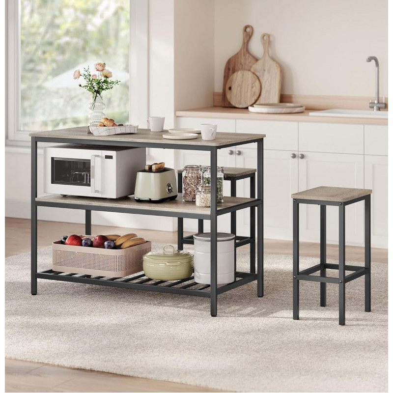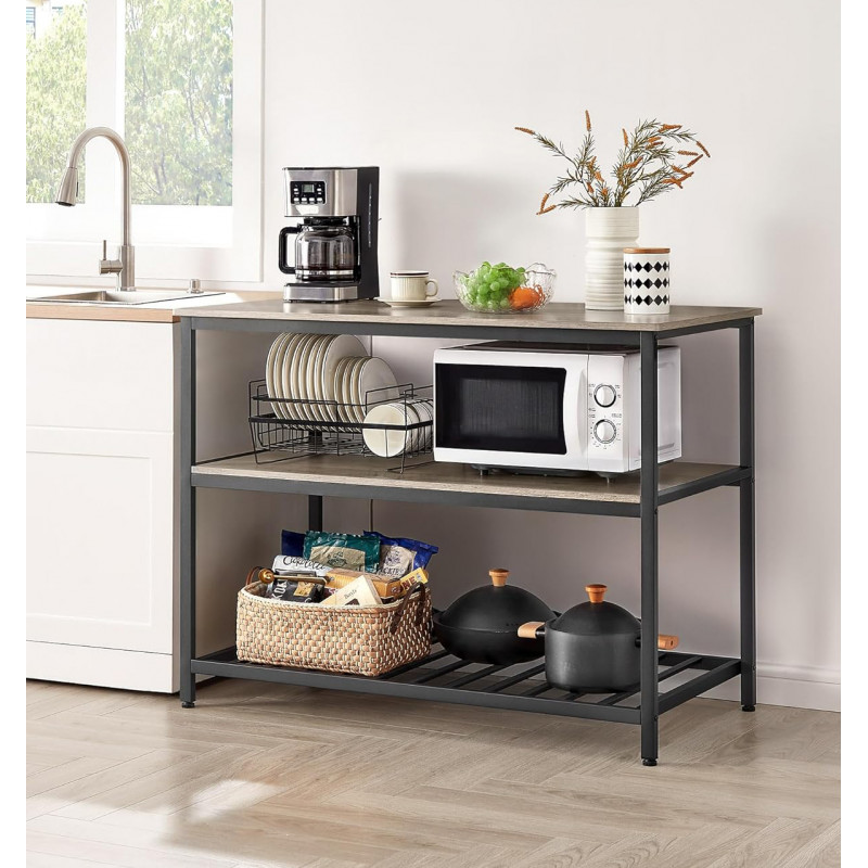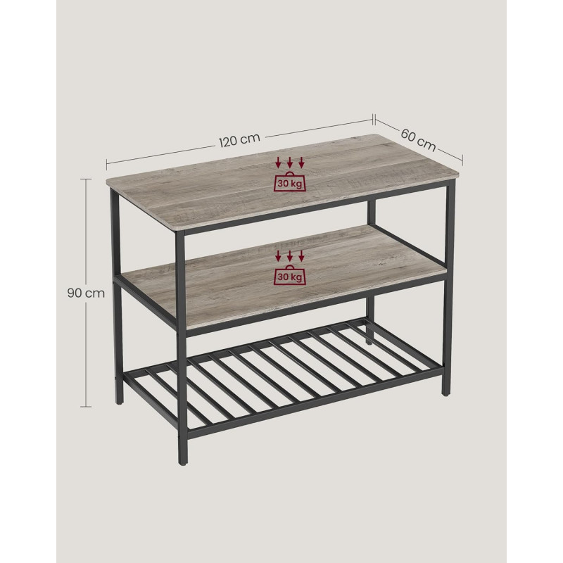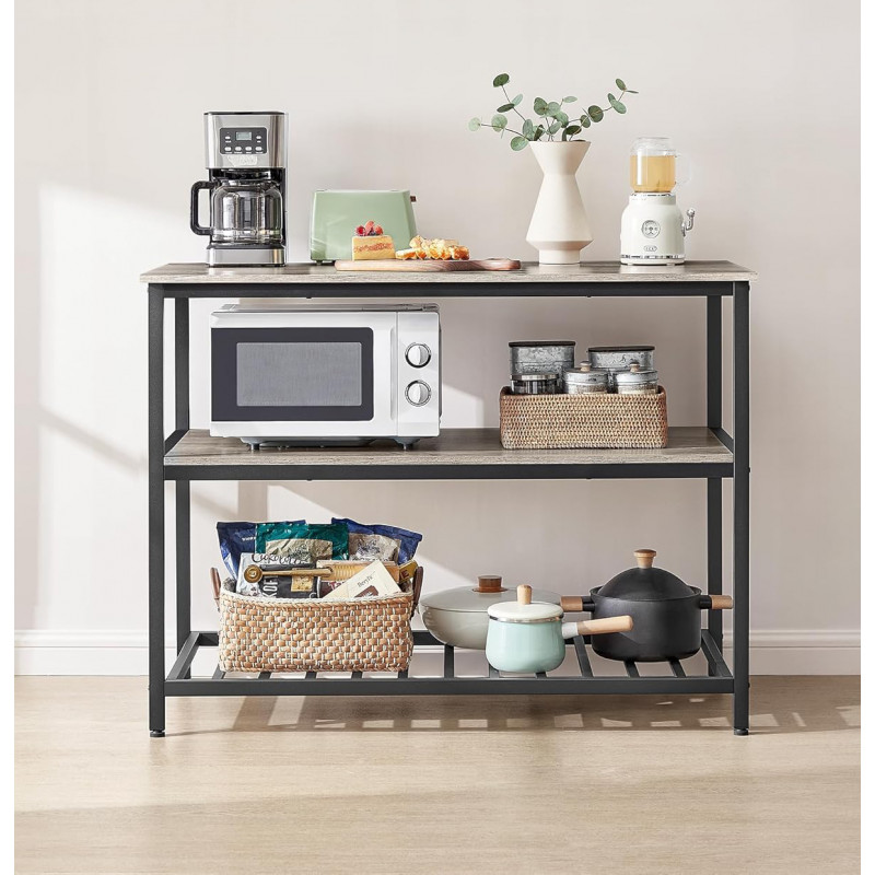 Capacitate de incarcare statica per raft: 30 kg Despre acest articol Pe suprafata de lucru de 60 x 120 cm a acestui raft de bucatarie, puteti pregati mancarea, avand in acelasi timp suficient spatiu pentru prajitorul de paine sau aparatul de cafea. Suprafata de lucru mare pentru un confort deosebit. Asezati o vaza de flori sau un set de ceai pe raftul de sus, aparatele de bucatarie pe raftul din mijloc, iar cutiile de depozitare cu ustensile de copt pe raftul de jos - totul este organizat pe acest raft de bucatarie cu 3 niveluri.Cu o inaltime de 90 cm, insula de bucatarie este extrem de versatila: folositi-o ca masa pentru micul dejun, ca bar de cafea sau ca masa pentru a servi bauturi... orice doriti! Picioarele reglabile asigura ca acest raft sta stabil si nu se clatina.Instalare usoara: Sunt incluse