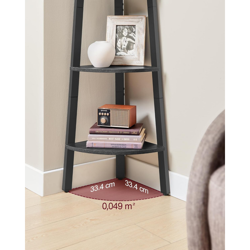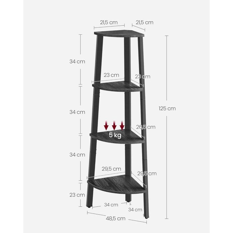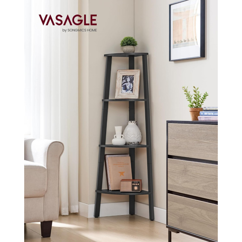 Instructiuni Note VASAGLE: Va rugam sa atasati raftul de colt la perete cu kitul anti-inclinare inclus pentru siguranta. Un raft pentru fiecare camera Umpleti un colt gol in camera de zi, folositi-l ca suport pentru plante de colt in birou pentru verdeata sau cuibariti-l in antreu, sufragerie sau dormitor ... aceasta unitate de raft de colt se potriveste oriunde Profitati la maximum de spatiul din colt Aceasta unitate de rafturi cu 4 niveluri, care masoara 33,4 x 33,4 x 125 cm, este conceputa pentru a va ajuta sa va utilizati pe deplin spatiul din colt. O puteti utiliza pentru a va organiza si expune eficient cartile, plantele, decoratiunile si multe altele Asamblare rapida Datorita