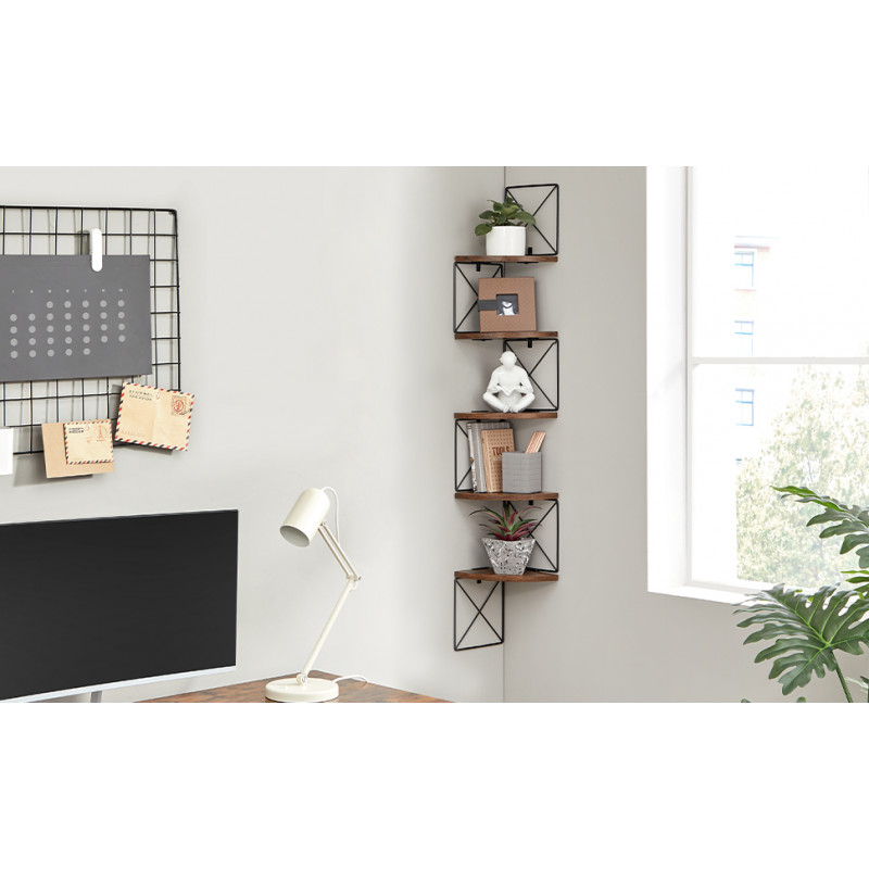 Capacitate de incarcare statica pe raft: 6 kg Raftul este universal si functional, se va potrivi perfect in sufragerie, dormitor, hol, birou sau baie, iar cele 5 rafturi ne vor facilita accesul la lucrurile noastre preferate.Fabricat cu un cadru de otel si placi aglomerate de calitate, acest raft de colt poate sustine pana la 6 kg pe nivel.O multime de spatiu: Cu o raza de 20 cm si o distanta de 20 cm intre rafturi, acest raft de colt ofera mult spatiu pentru articolele tale.Usor de curatat: Pur si simplu folositi o carpa umeda pentru a curata acest raft de colt, este usor si convenabil!