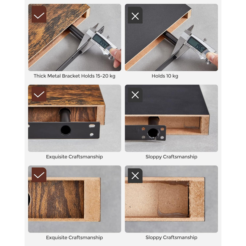 Greutate: 2,2 kg Despre acest articol Fotografiile dvs. de familie sunt ascunse intr-un sertar? Cu acest raft de perete (lungime 60 cm, sustine intre 10 si 15 kg) iti poti prezenta fotografiile, cartile, obiectele decorative, CD-urile, condimentele etc.Raftul plutitor maro vintage nu serveste doar la depozitarea accesoriilor, ci este si un decor unic pe cei patru pereti. Indiferent daca se afla in sufragerie, dormitor, hol sau bucatarie.Retinere stabila: Desi un aspect atractiv este important, conteaza si valorile interne. De aceea am proiectat un raft de perete foarte solid si realizat din MDF de inalta calitate. Asa ca te poti bucura de el multi ani.Asamblarea: Partile marcate si