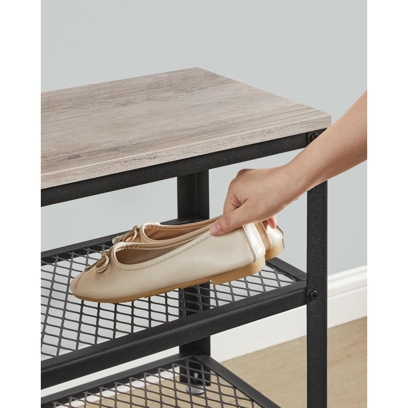Scurta descriere: Aceasta bancuta pentru pantofi VASAGLE imbina utilul cu esteticul. Cu doua rafturi metalice incapatoare si un blat superior robust, iti ofera o solutie practica si eleganta pentru organizarea pantofilor si a accesoriilor din hol sau living.