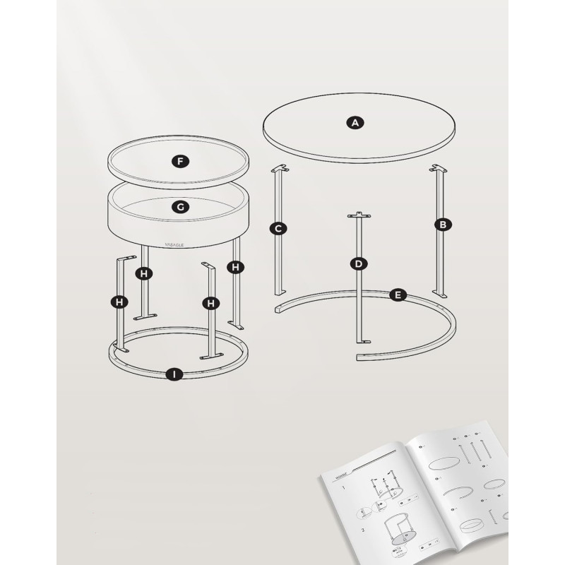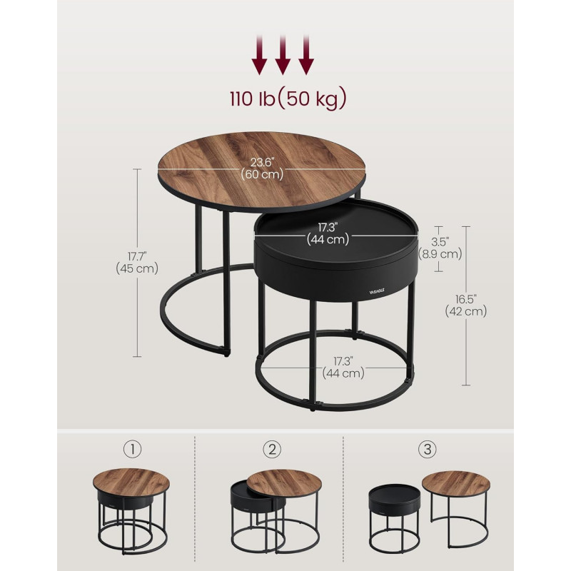 Scurta descriere: Acest set de 2 masute rotunde VASAGLE imbina eleganta moderna cu functionalitatea. Designul nesting permite economisirea spatiului, iar compartimentul ascuns din masuta mica este perfect pentru depozitarea obiectelor marunte. Ideale pentru living, dormitor sau balcon.