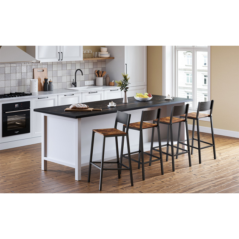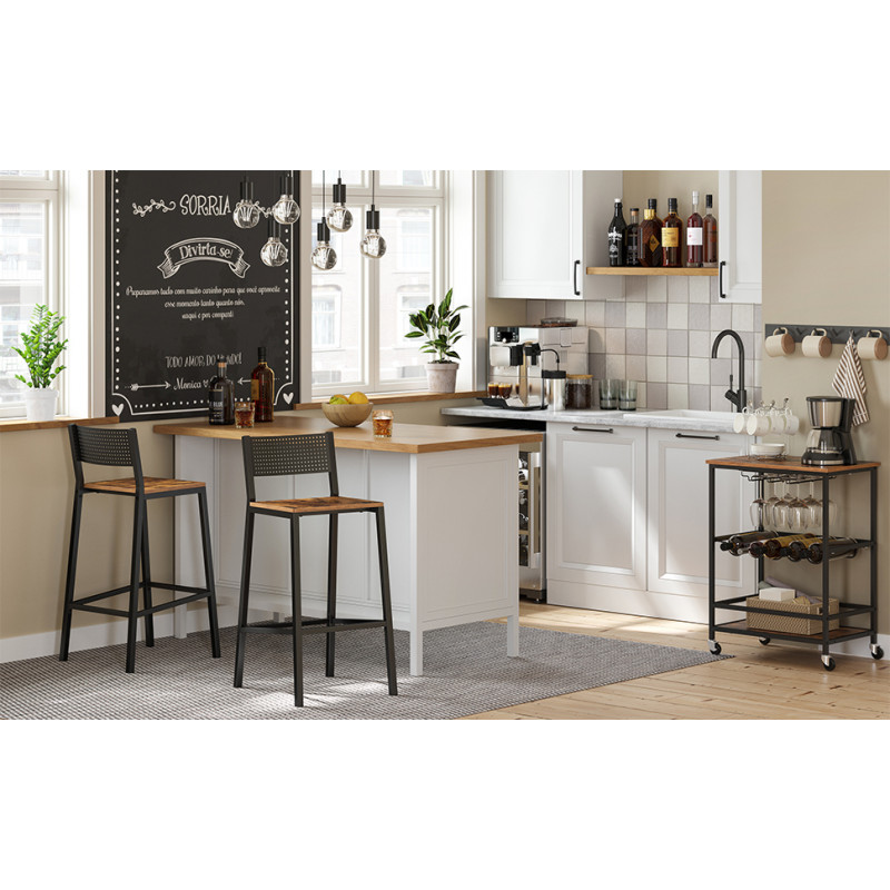 Panourile maro rustic, metalul negru mat si spatarul ajurat aduc o noua aroma barului, bucatariei sau sufrageriei dvs.