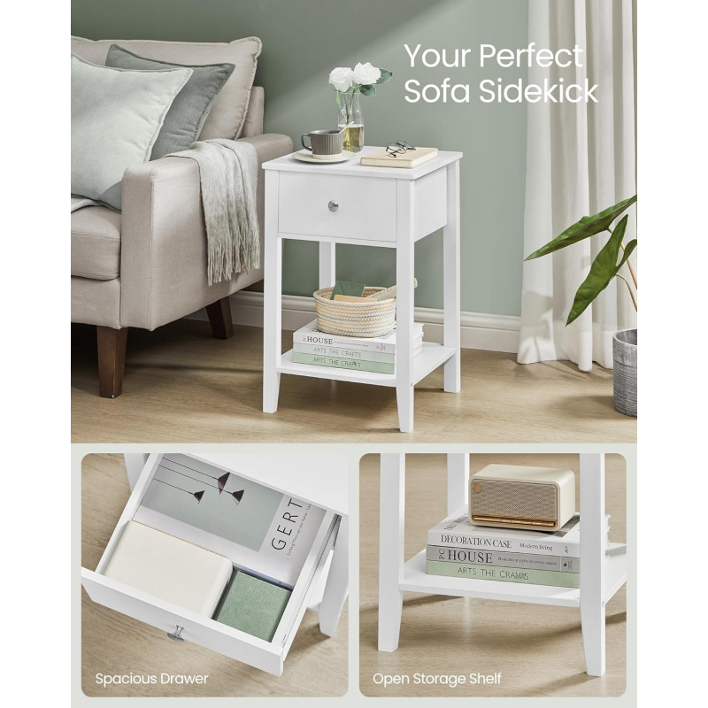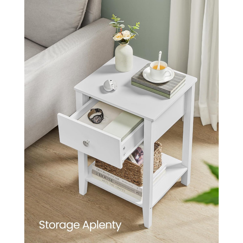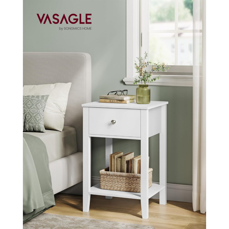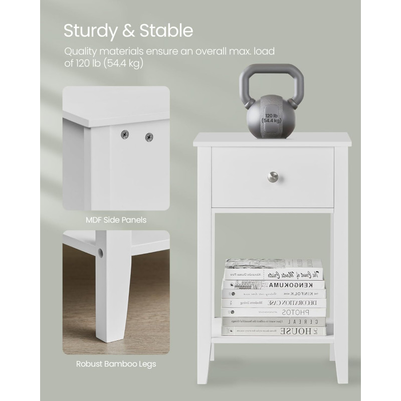instructiuni Note VASAGLE: - Va rugam sa nu depasiti capacitatea maxima de incarcare a fiecarei mese de noptiera. Rezistenta bambusului Datorita picioarelor si blatului de masa din bambus natural, aceasta noptiera este extrem de robusta si durabila. Blatul mesei poate sustine o greutate maxima de 45 de kilograme, in timp ce sertarul si raftul pot sustine fiecare o greutate maxima de 4.5 kilograme. Minimalist si elegant Cu liniile sale clare si culoarea alba tulbure, „less is more” se aplica noptierei. Ea emana un farmec atemporal si se potriveste fara efort in orice camera, fie ca este vorba de dormitor, living sau alte camere mici. Mult spatiu de depozitare Fiecare masuta ofera o tava mare pentru lampi sau decoratiuni, un sertar inchis pentru obiecte personale si un raft deschis in partea de jos pentru carti sau reviste - indeplinind toate nevoile dvs. de depozitare! Usor de intretinut Datorita suprafetei lacuite rezistente la apa, aceasta masuta de cafea este usor de intretinut. Daca se murdareste, pur si simplu stergeti-o cu o carpa umeda pentru a o face sa arate proaspata si noua. Acest lucru economiseste o multime de timp si efort Asamblare fara efort Nu va faceti griji cu privire la munca de asamblare complicata! Datorita pieselor clar marcate si a