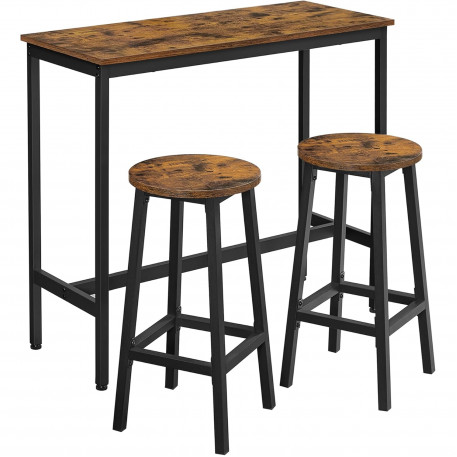 Scurta descriere Setul masa bar cu 2 scaune este ideal pentru bucatarie, living sau un colt de mic dejun. Designul industrial combina blatul maro rustic cu structura metalica neagra, oferind un aspect modern si stabilitate ridicata. Dimensiunea compacta il face potrivit si pentru spatii mai mici.
