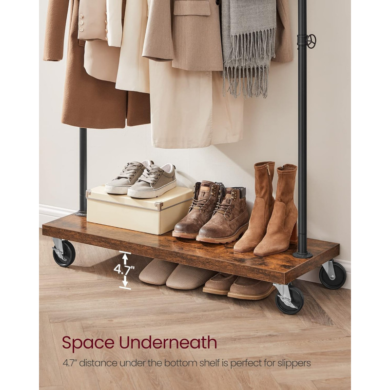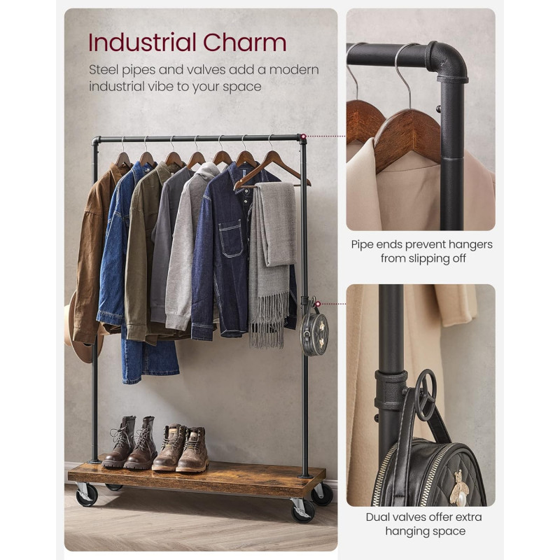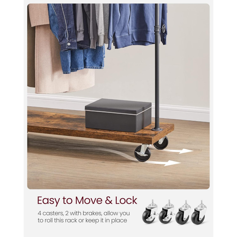 Scurta descriere Suportul pentru haine VASAGLE combina designul industrial cu functionalitatea practica. Bara metalica rezistenta permite agatarea paltoanelor sau jachetelor groase, iar raftul inferior ofera spatiu pentru pantofi, cutii sau accesorii. Datorita rotilor, suportul poate fi mutat cu usurinta in dormitor, dressing sau magazin, iar franele integrate il mentin stabil atunci cand este necesar.