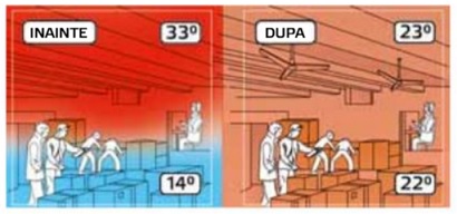 Aerul cald se ridica la tavan. Ventilatorul de tavan Master impinge caldura jos, catre podea. Rezulta o economie de energie de circa 30%