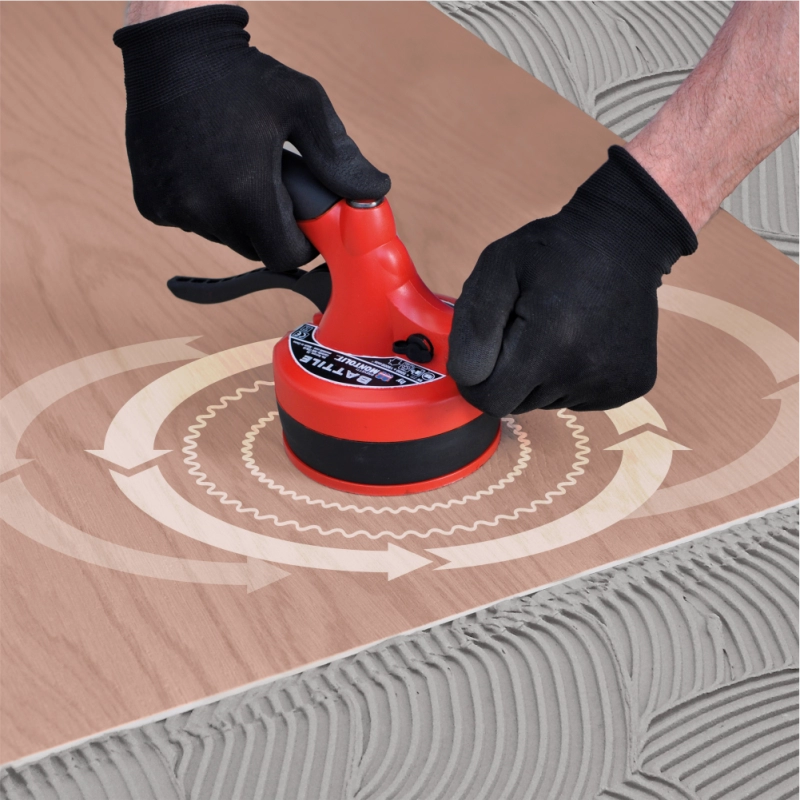 Alimentata cu baterie litiu-ion, ventuzele BATTILE sunt echipamente compacte și ușoare care sunt proiectate să îndepărteze prin vibrație orice bule de aer din plăcile lipite imediat după ce au fost instalate. Echipamentele BATTILE sunt capabile să ridice și să așeze ușor plăcile mici și medii.